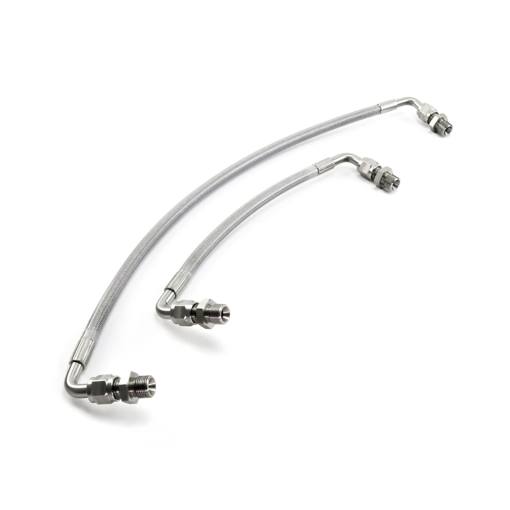 Integrated braided turbo oil feed pipe and AVCS replacement braided flexible hoses, which replace the original hard lines on your OEM turbo which are prone to fracturing or splitting over time.
